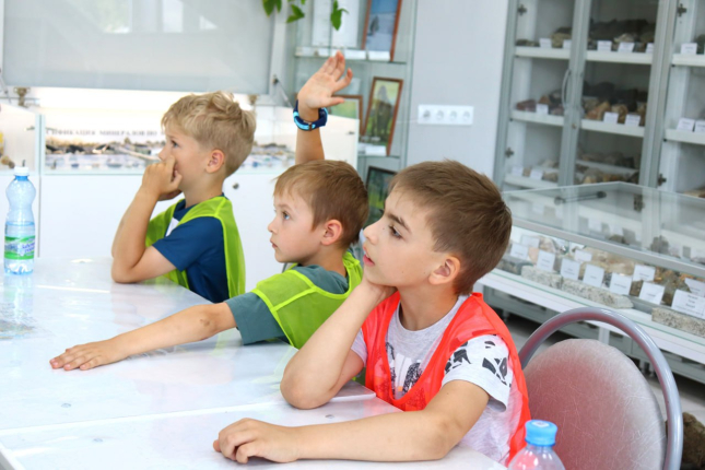 Посмотреть на содержимое геологического кабинета пришли воспитанники летнего лагеря «Роллер-Омск». 68 школьников от 5 до 12 лет подробнее узнали об истории и происхождении некоторых минералов, порисовали графитом и познакомились с «охранником» коллекции – котом Василием.