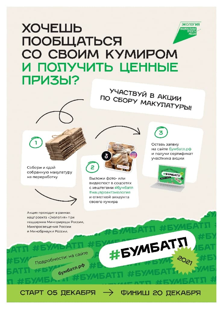 С 5 по 20 декабря в нашей стране пройдет акция #БумБатл. #БумБатл 2021 года – это соревнование среди трех категорий участников: учащихся российских школ, вузов, а также сотрудников предприятий. Акция проводится АНО «Национальные приоритеты» в рамках инициатив национального проекта «Экология», при поддержке Минприроды России.