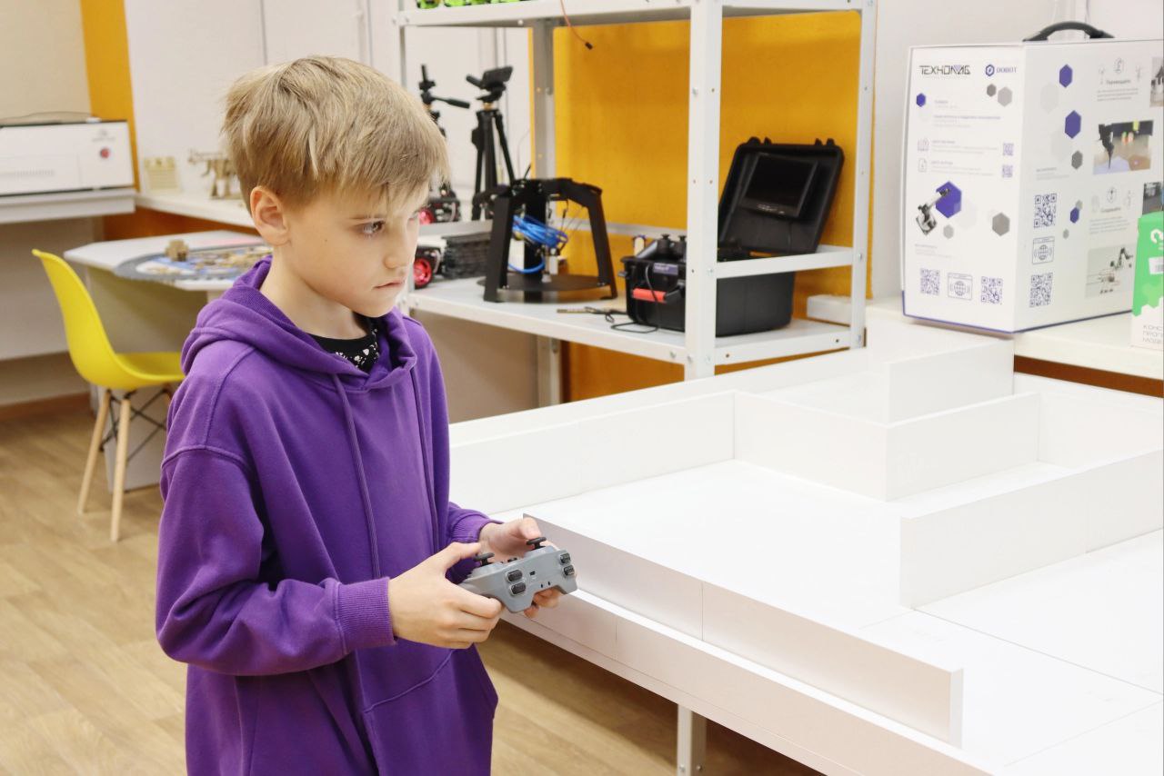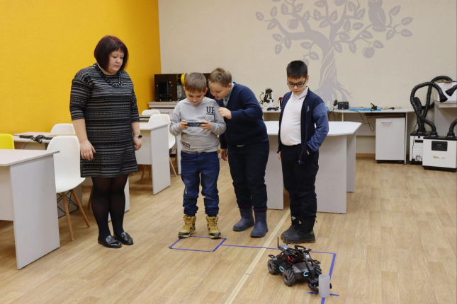 Директор кванториума Виктория Басгаль рассказала школьникам о робототехнических комплектах для изучения основ конструирования, программирования, технического зрения, реверсивного инжиниринга, прототипирования и аддитивных технологий. В техноквантуме ребята распределились на команды и с помощью роботов преодолели трассу с препятствиями.