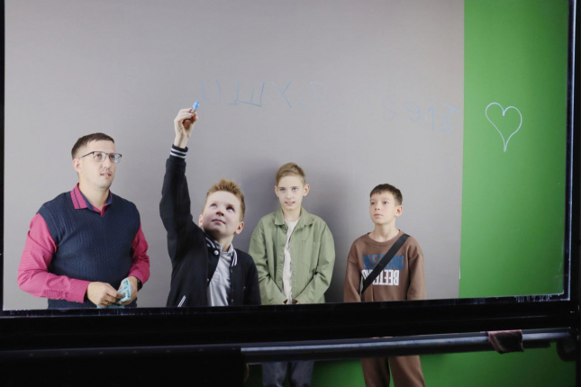 В медиаквантуме начальник отдела ресурсного обеспечения образовательного процесса ОмГПУ Евгений Романчук провел для пятиклассников мастер-класс. Ребята поработали с телесуфлером, научились управлять камерами с помощью джойстиков, записали видео на фоне хромакея и попробовали себя в роли ведущих и видеооператоров.
