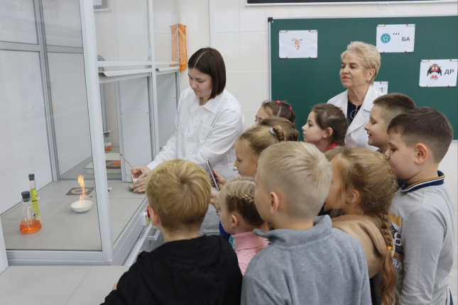 В лаборатории аналитической химии завкафедрой химии и методики преподавания химии ОмГПУ Ольга Курдуманова и студентка факультета естественнонаучного образования Александра Русанова провели вместе со школьниками химические опыты. Смешивая различные химические вещества, второклассники и пятиклассники собрали из реактивов цветную радугу в пробирках, сварили зелье Бабы Яги из перекиси водорода, перманганата и средства для мытья посуды. При помощи щелочи ребята вместе с преподавателями проявили розовый цвет на белых цветах, решили ребусы, окрасили пламя в зеленый цвет и посмотрели действие мини-вулкана.
