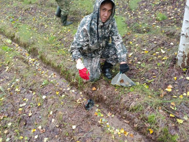 Студент-биоэколог Вахитов Д.В. на проверке ловчей канавки в мелколиственном лесу, Тевризский район.
